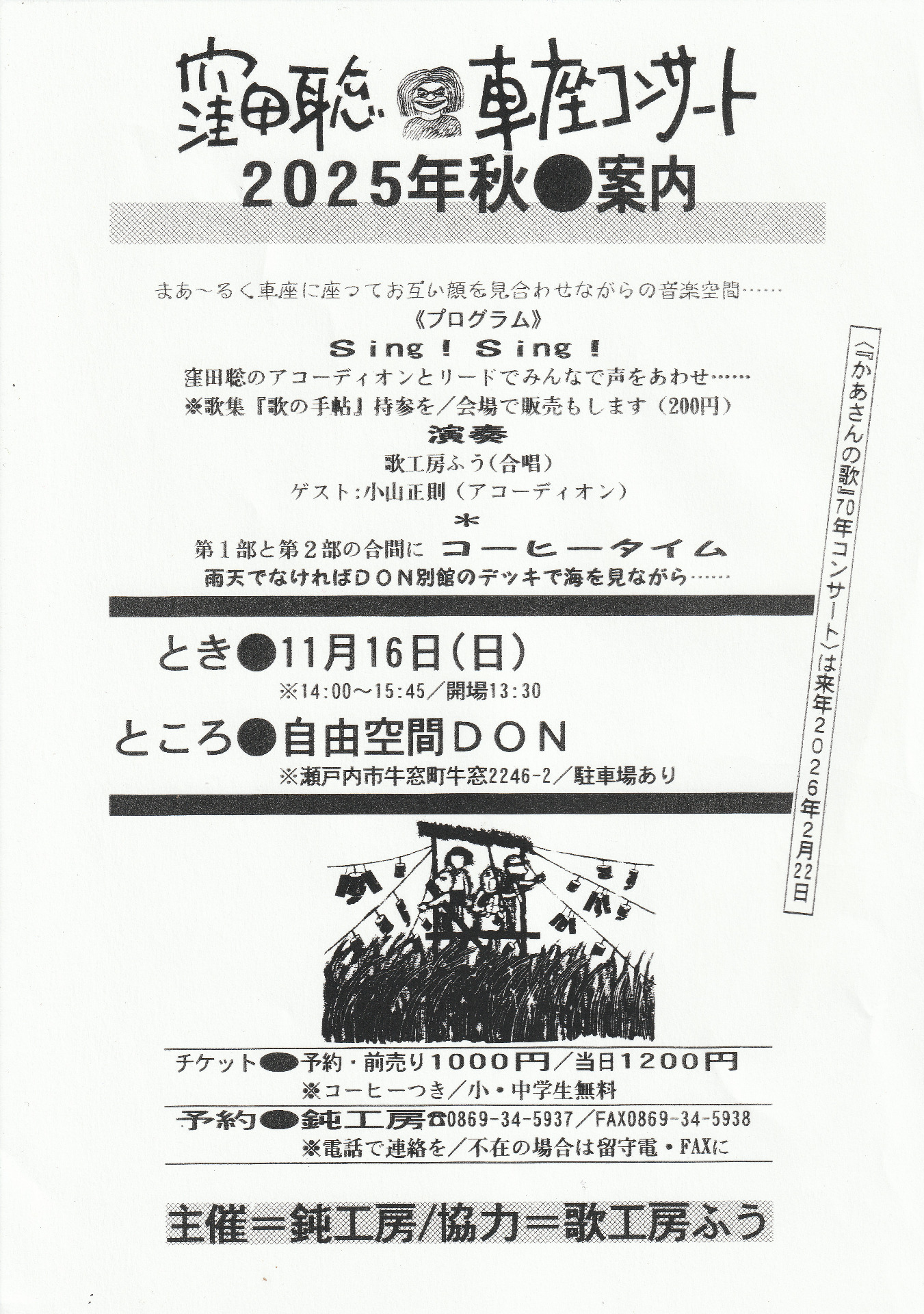 チケット:予約・前売り1,000円 当日1,200円(コーヒーつき/小・中学生無料)
